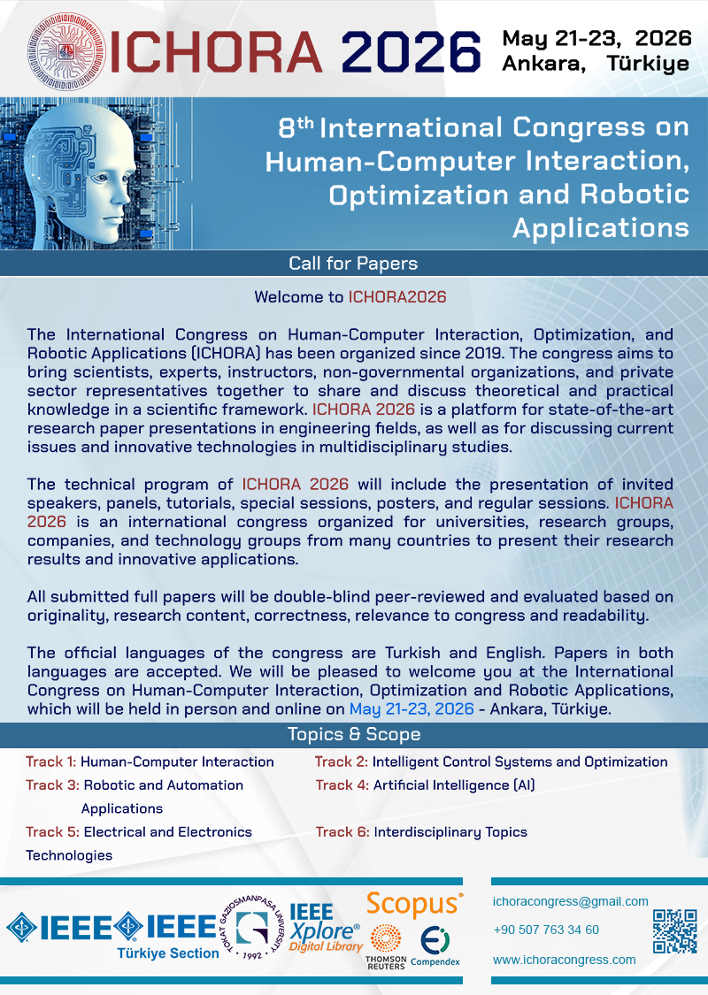 The International Congress on Human-Computer Interaction, Optimization, and Robotic Applications (ICHORA) has been organized since 2019. The congress aims to bring scientists, experts, instructors, non-governmental organizations, and private sector representatives together to share and discuss theoretical and practical knowledge in a scientific framework. ICHORA 2026 is a platform for state-of-the-art research paper presentations in engineering fields, as well as for discussing current issues and innovative technologies in multidisciplinary studies.